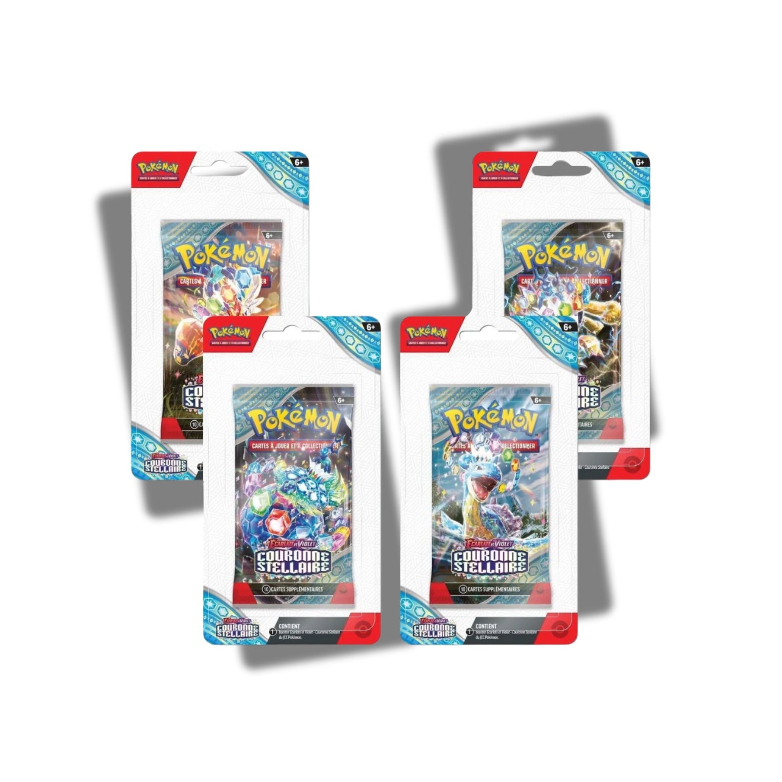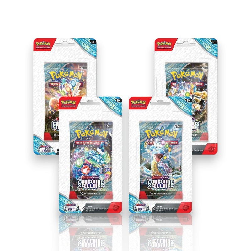 Chaque Artset Blisters contient 4 boosters scellés de la série Écarlate et Violet – Couronne Stellaire (EV07).